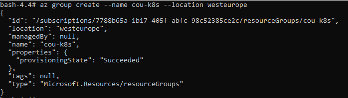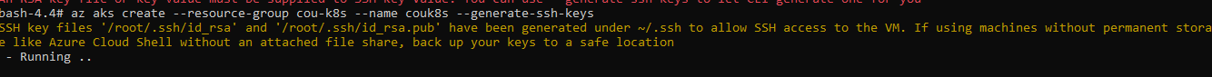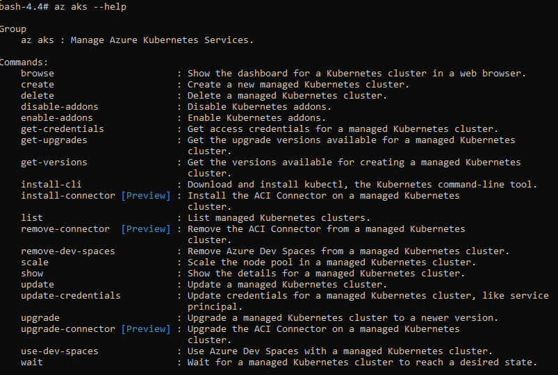 Una vez creado el grupo de recurso, podemos crear el clúster de kubernetes. Azure-cli tiene un comando AKS que nos permite interactuar con el servicio AKS. Este comando tiene varios subcomandos que nos permiten trabajar con los clústers: