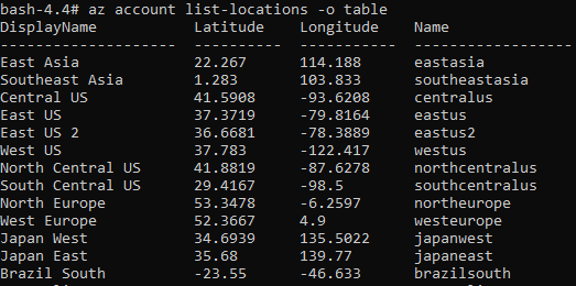Con el comando az account list-locations se obtiene la lista de regiones disponibles.