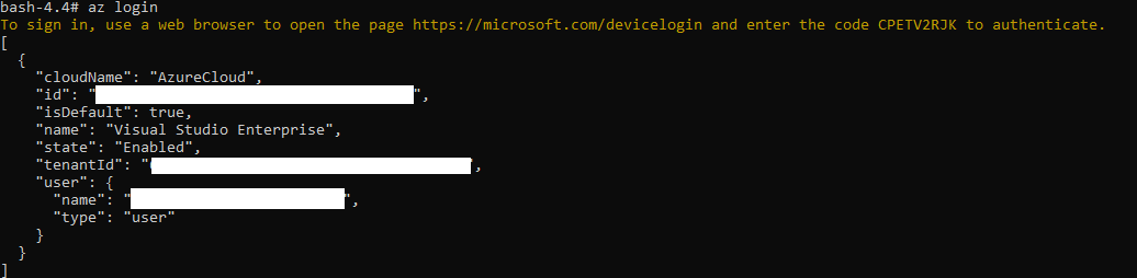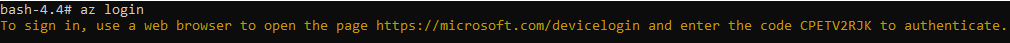 Una vez verificado que tenemos la versión instalada, tenemos que hacer login en Azure, ejecutamos el comando az login, el cual nos devuelve una url y un código para autenticar.