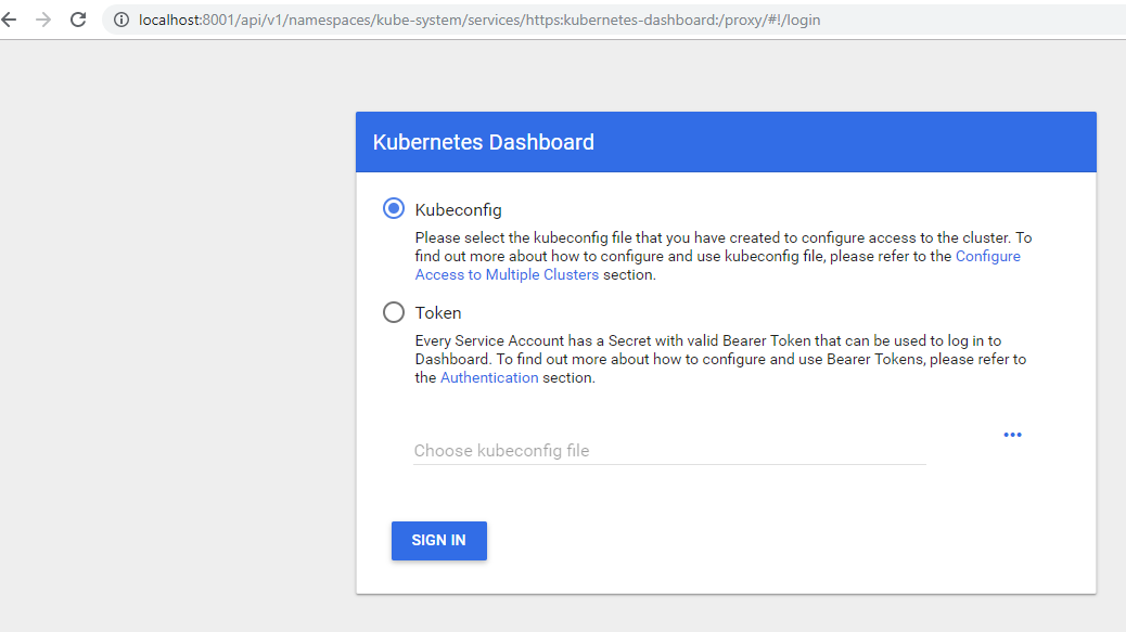 Ahora, en el navegador ponemos la siguiente url http://localhost:8001/api/v1/namespaces/kube-system/services/https:kubernetes-dashboard:/proxy/
