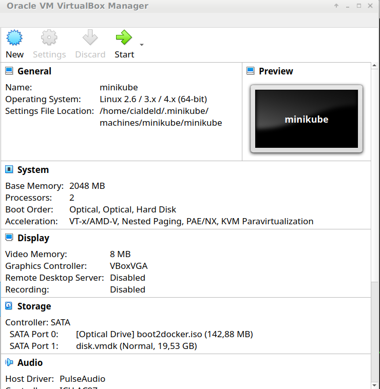 Descarga una ISO de 142 megas al ponerse a funcionar y creará una máquina virtual llamada “minikube” con 2 Vcpu y 2 gb ram.