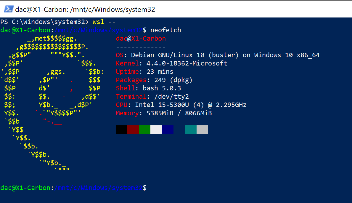 Dentro del entorno con Debian, neofetch nos muestra el kernel 4.4.0 Microsoft. Los recursos con los que disponemos (son los reales del equipo físico), paquetes instalados y todo nos hace creer que es un equipo virtual.