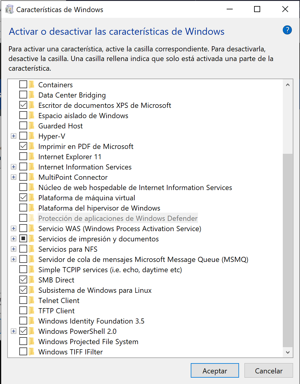 Entra las características, debemos activar ciertos componentes.