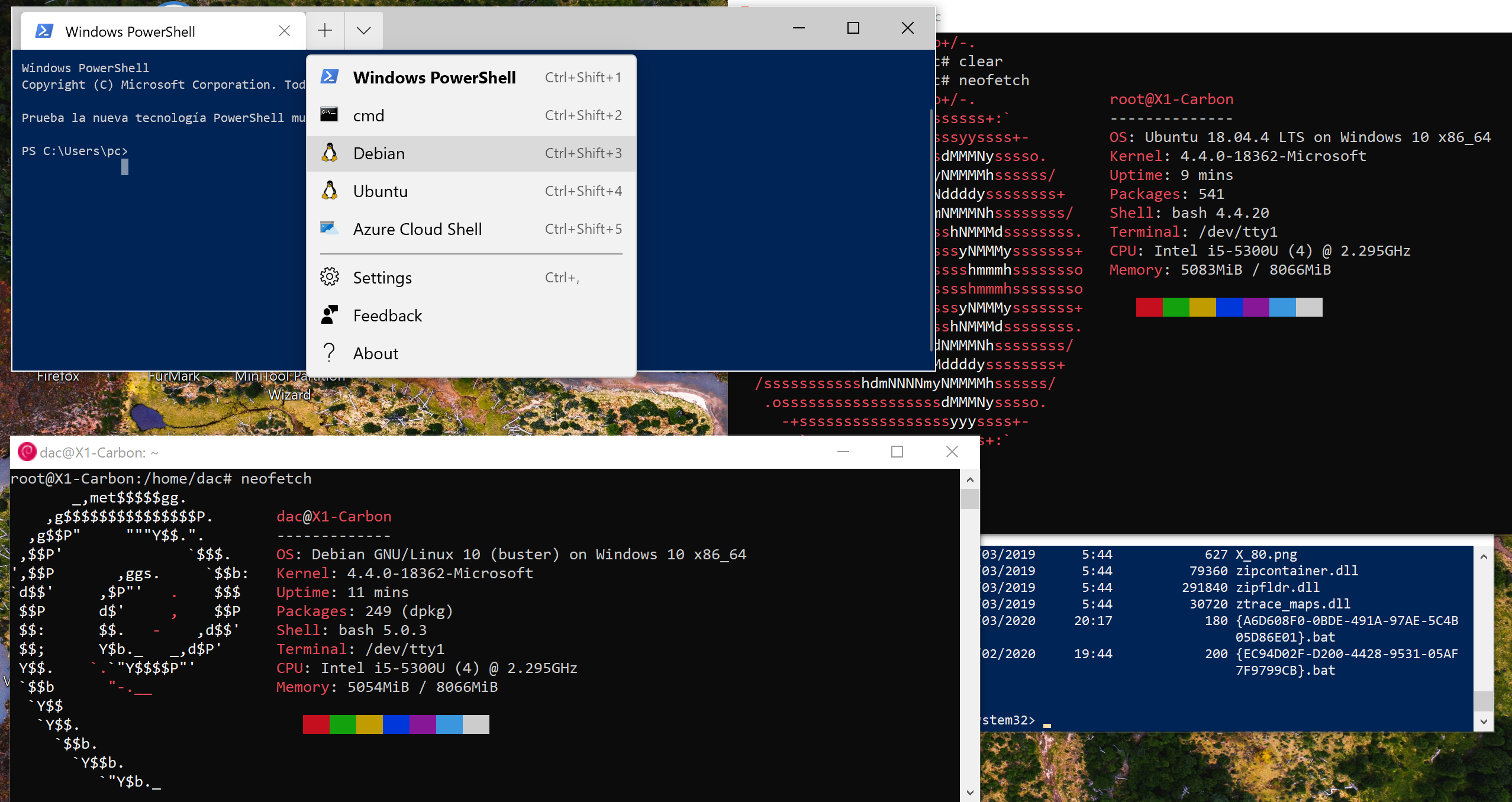 Captura de pantalla, con el PowerShell y dos entornos Linux corriendo (Ubuntu y Debian), cada uno de ellos requiere actualizaciones y posee un espacio de almacenamiento independiente. Sin ser una virtualización tal como la conocemos (Virtualbox, vmware o Hyper-V) es algo similar.