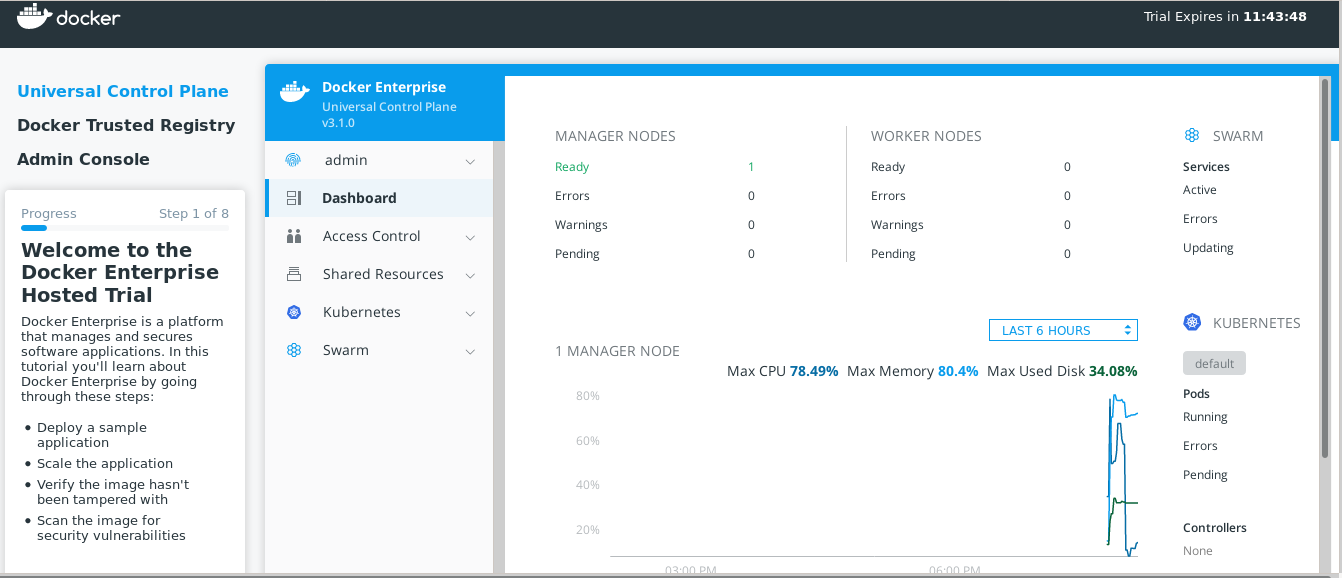 Nos permiten probar Docker Enterprise durante 12 horas, nos provéen una interfaz web y recursos virtuales en servidores del sitio Docker.
